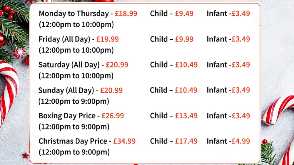 - Boxing Day (26th December) – 12 noon to 10:00 pm